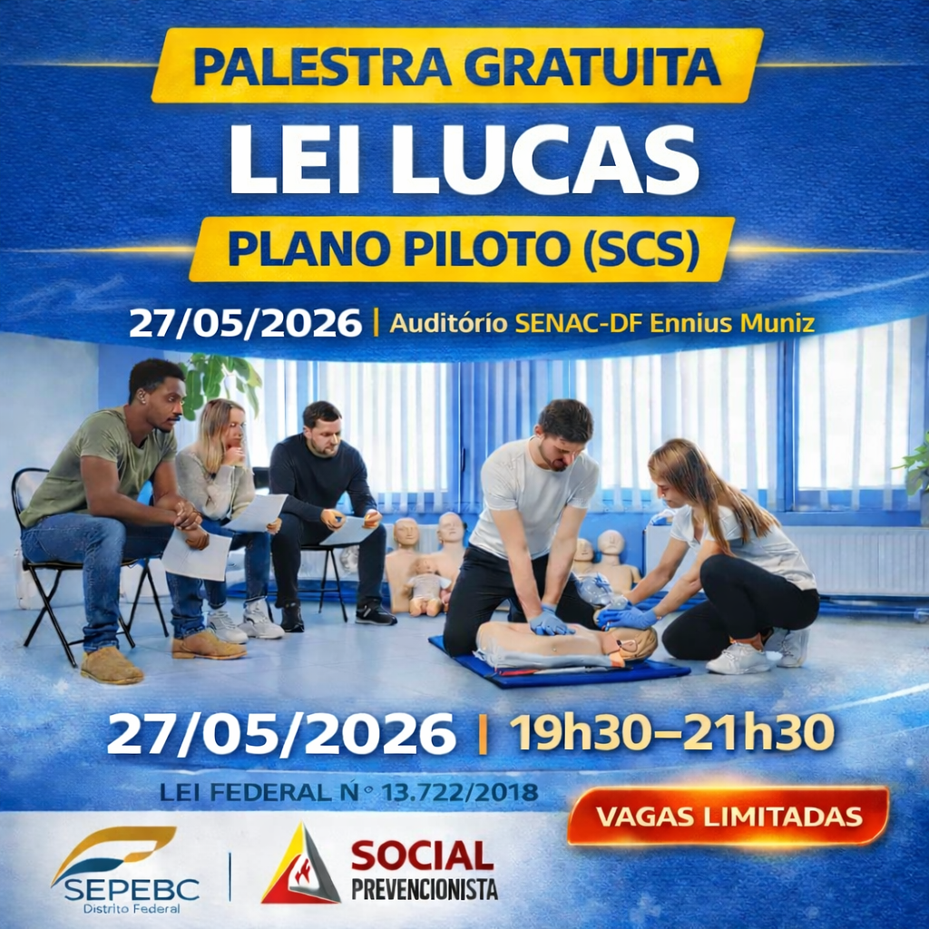 04/06/2026 | 19h30 às 21h30 Palestra presencial gratuita (19h30 às 21h30) de Primeiros Socorros – Lei Lucas (Lei Federal nº 13.722/2018). Indicada para profissionais de escolas, creches, recreação infantil, empresas e comunidade. VAGAS LIMITADAS POR AUDITÓRIO Local (apoio): Auditório SENAC-DF – Miguel Setembrino – SCS Qd. 4, Bl. A, Lote 106/136, Asa Sul (CEP 70304-906). Realização: Instituto SP Social Prevencionista e SEPEBC. Inscrição obrigatória para controle de vagas.