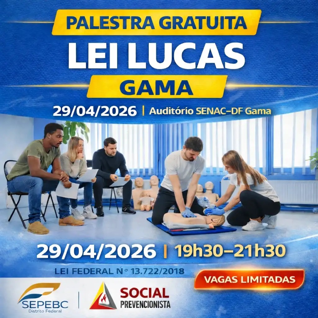 Palestra presencial gratuita de Primeiros Socorros, realizada em conformidade com a Lei Lucas (Lei Federal nº 13.722/2018), com orientações práticas e conteúdo essencial para ambientes escolares, corporativos e comunitários.
