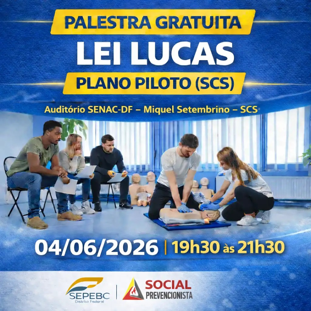 Palestra presencial gratuita de Primeiros Socorros, realizada em conformidade com a Lei Lucas (Lei Federal nº 13.722/2018), indicada para profissionais de escolas, creches, recreação infantil, empresas e comunidade em geral.
